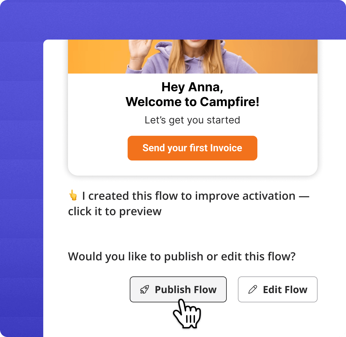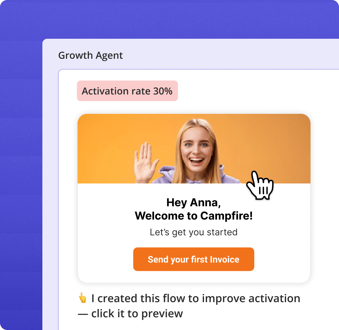 Instead of just sending an alert, the Agent automatically creates the perfect in-app message, tour, or survey needed to solve the issue.